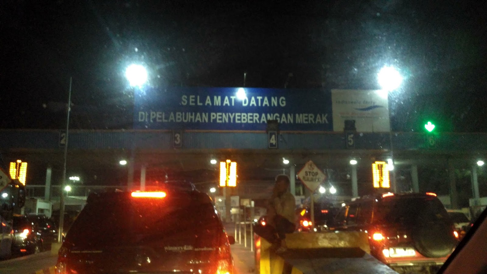 sekitar adalah 4 jam di jalan sampai ke Merak, akhirnya masuk juga ke dalam pelabuhannya.